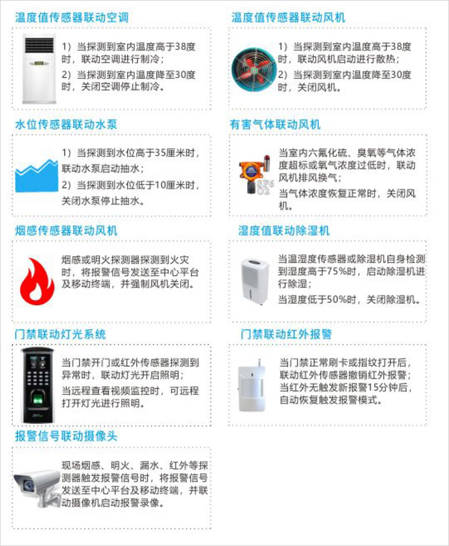 环境采集传感器可以接入大华环境数据采集单元,实现环境数据实时采集、展示,包括:温湿度数据、水浸报警、红外对射报警、电子围栏报警、红外双鉴报警、风速等数据,实现周界安防监控报警、环境监控报警以及智能控制联动。